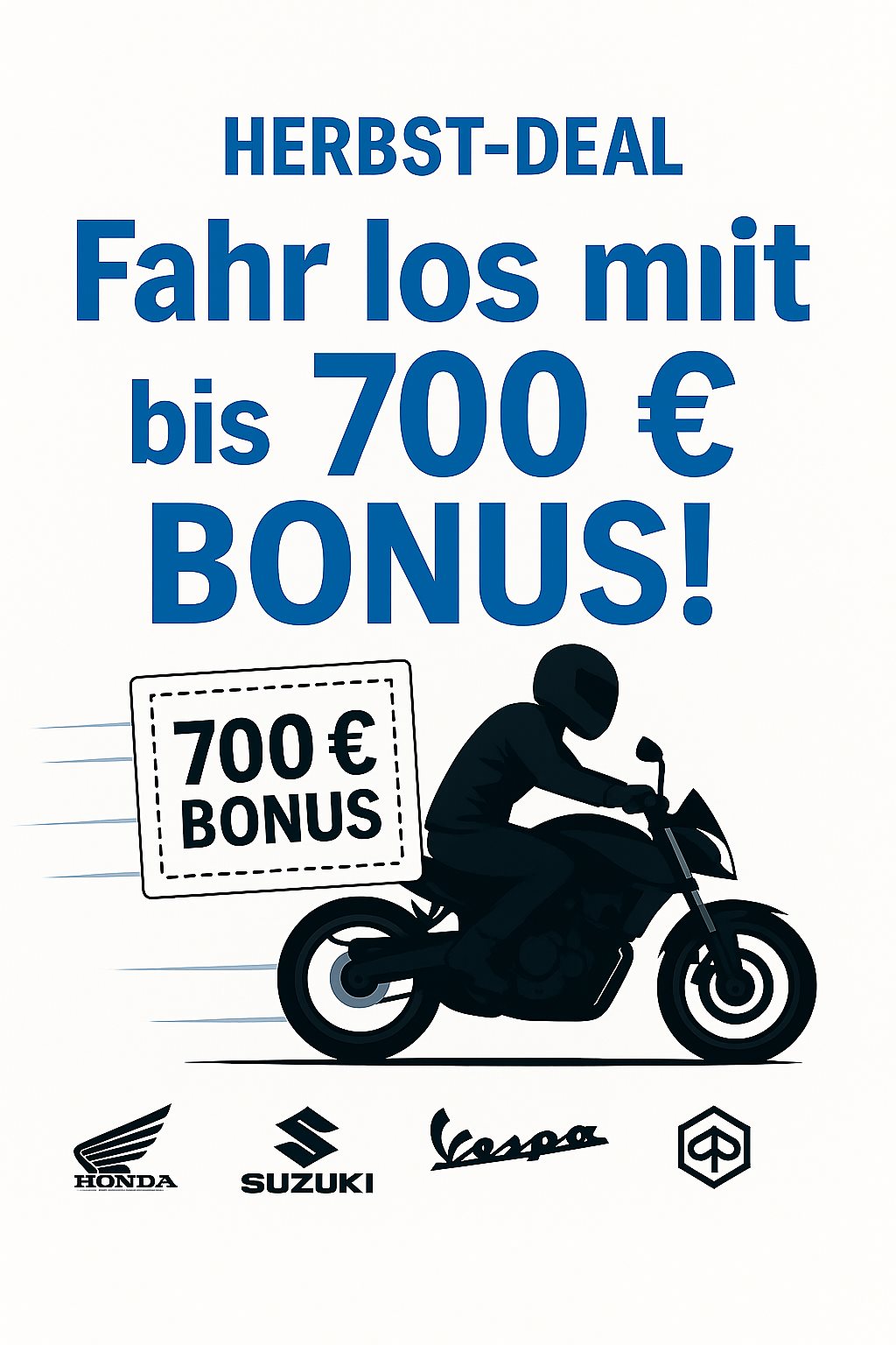 Beim Kauf eines ausgewählten Fahrzeugs erhältst du bis zu 700 € in Gutscheinen – einlösbar für Zubehör, Bekleidung oder Serviceleistungen bei uns im Haus.
